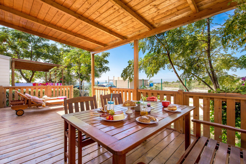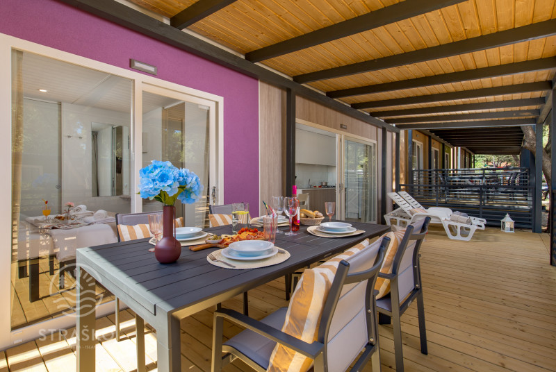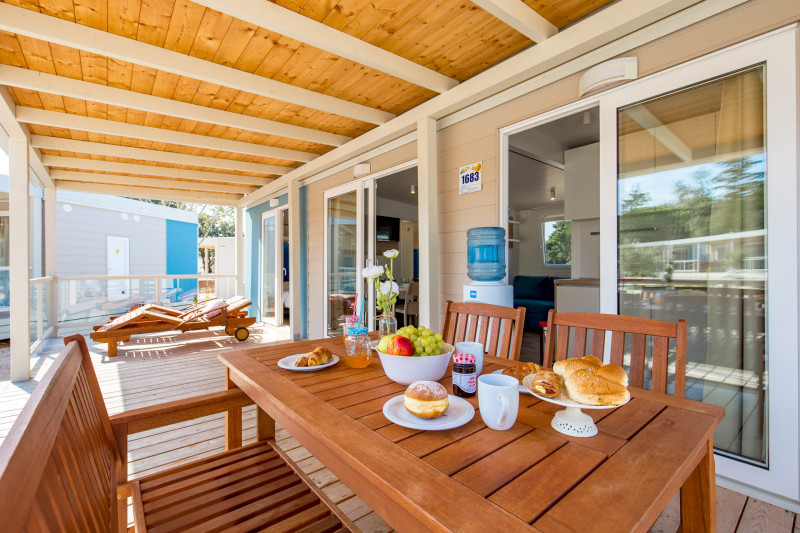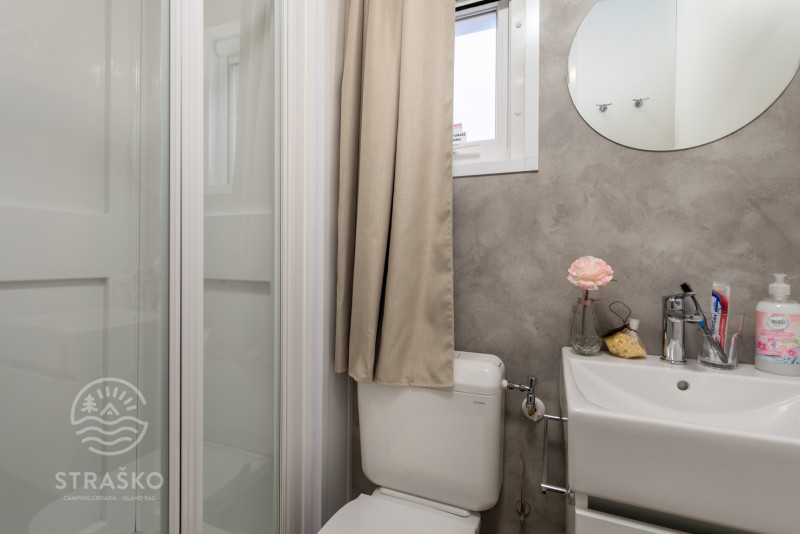 MOBILNE HIŠICE: vse mobilne hišice imajo klimo, SAT TV in WiFi ter opremljeno nadkrito teraso. Parkirno mesto ob hišici.