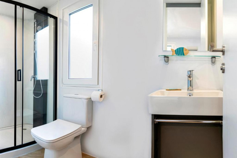 Mobilna hišica Relax 5+1 (B): prib. 34 m2; 3 spalnice (ena z zakonsko posteljo, drugi dve z ločenima ležiščema), kuhinjska niša (pomivalni stroj) in dnevni prostor, 2 kopalnici (prha/WC).