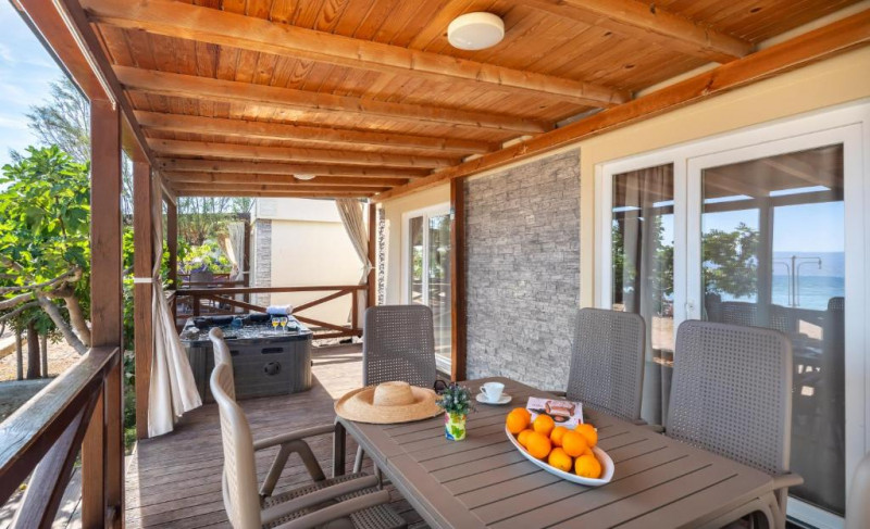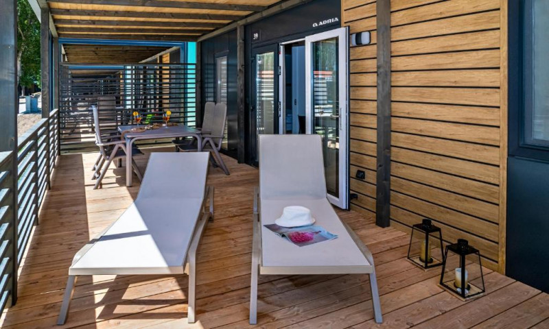Mobile home Relax 6+2 premium 2nd line – whirlpool: prib. 40 m2; 3 spalnice (ena z zakonsko posteljo, drugi dve z ločenima ležiščema), kuhinjska niša (pomivalni stroj) in dnevni prostor s kotnim kavčem 130x195 cm, 2 kopalnici (prha/WC). Nahajajo se v 2. vrsti od morja, prib. 20 m do plaže. Dodatno whirpool na terasi.