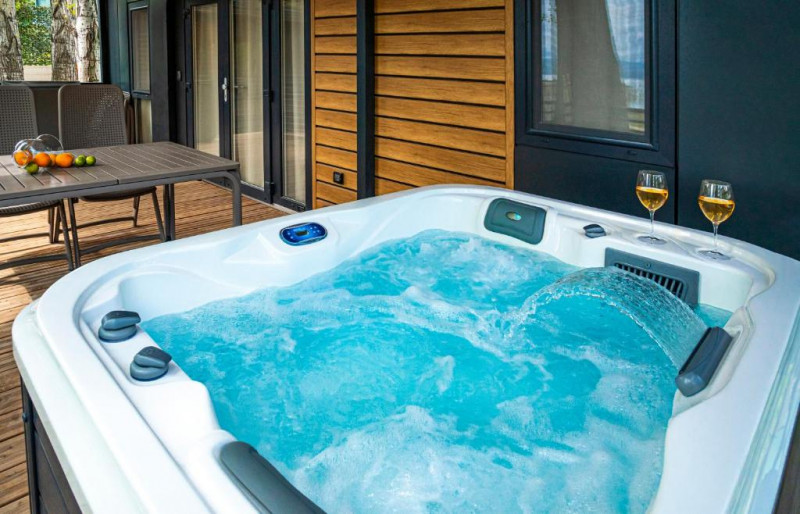 Mobile home Sunshine 6+2 premium 1st line – whirlpool: prib. 40 m2; 3 spalnice (ena z zakonsko posteljo, drugi dve z ločenima ležiščema), kuhinjska niša (pomivalni stroj) in dnevni prostor s kotnim kavčem 130x195 cm, 2 kopalnici (prha/WC). Dodatno whirpool na terasi. Prva vrsta od morja.