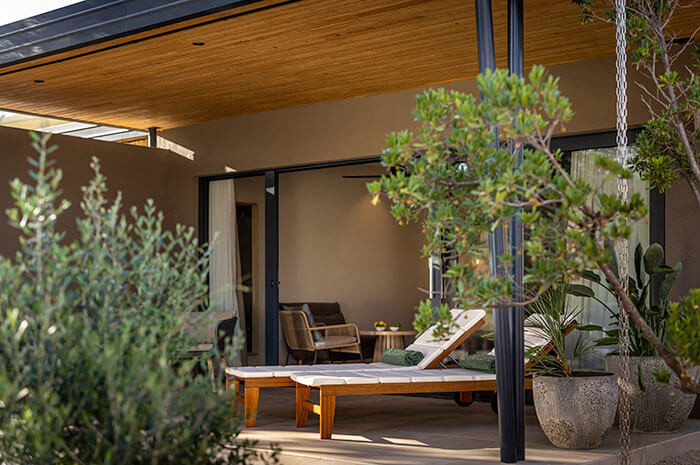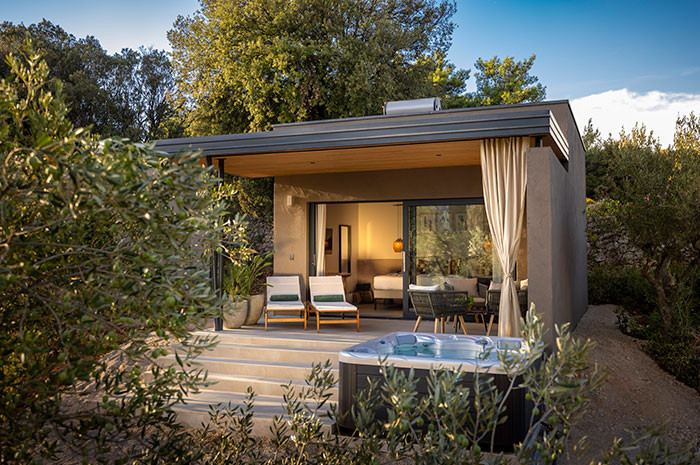 Villa 2+1 jacuzzi: prib. 25 m2, dnevni prostor z zakonsko posteljo in dodatnim ležiščem, lounge terasa z masažno kadjo.