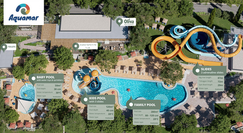 BAZENI IN WELLNESS: vodni park Aquamar premium s tremi bazeni (družinski bazen 250 m2, otroški bazen 100 m2, bazen za dojenčke 50 m2, vsi polnjeni s sladko vodo), 3 adrenalinski tobogani in vodne atrakcije. Z doplačilom Sun & Spa – wellness oaza v avtentičnem sredozemskem okolju s posebej zasnovanimi tretmaji za popolno sprostitev.