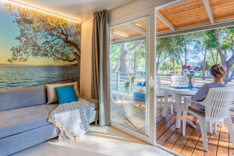 MOBILNE HIŠICE: opremljene s klimo, SAT TV, vrtno garnituro na terasi. Parkirišče. Od morja oddaljene do 100 m.